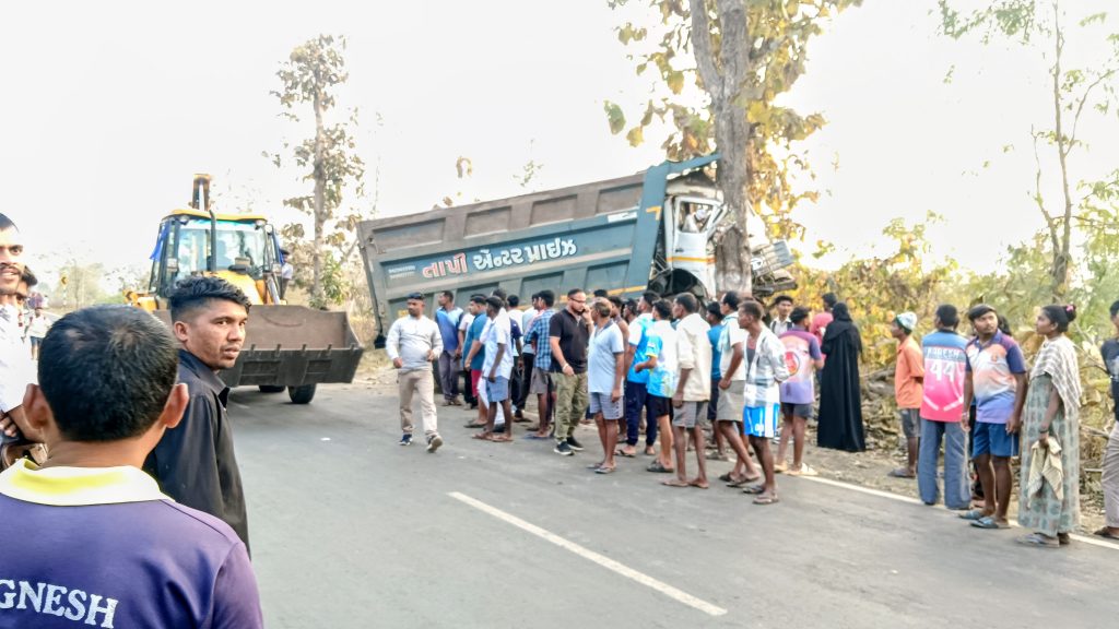 डांग : आहवा–वघई मार्ग पर नडगखादी गांव के पास आज शाम करीब 5:30 बजे एक गंभीर सड़क दुर्घटना हुई। आहवा से पिंपरी की ओर जा रहा लोडिंग डम्पर (वाहन नंबर GJ 26 T 9944) अचानक चालक के नियंत्रण से बाहर हो गया और सड़क किनारे स्थित एक बड़े पेड़ से जा टकराया।