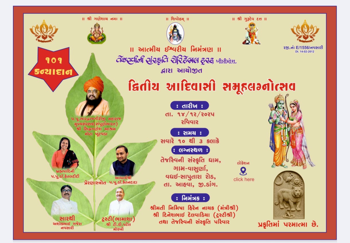 डांग : धार्मिक एवं सामाजिक उत्थान के नेक उद्देश्य से डांग जिले के वासुरना में स्थित तेजस्वी संस्कृति धाम द्वारा आदिवासी सामूहिक विवाह का भव्य आयोजन किया गया है। दिनांक 14/12/2025, रविवार को इस द्वितीय आदिवासी सामूहिक विवाह महोत्सव में आर्थिक रूप से कमजोर परिवारों की 101 कन्याएं सांसारिक जीवन में अपना कदम रखेंगी। यह कार्यक्रम न केवल एक विवाह समारोह होगा, बल्कि संस्कृति, धर्म और समाज सेवा के एकीकरण का एक उत्कृष्ट उदाहरण भी होगा। इस सामूहिक विवाह महोत्सव का आयोजन तेजस्वी संस्कृति चैरिटेबल ट्रस्ट द्वारा किया गया है। इन्हें परम पूज्य संत श्रीमद जगद्गुरु रामानंदाचार्य स्वामी राम नरेशाचार्यजी महाराज का पावन आशीर्वाद प्राप्त है और यह शुभ कार्य पूज्य आद्य शक्ति माताजी के पावन सान्निध्य में संपन्न होगा। इस धाम का मुख्य उद्देश्य आदिवासी समुदाय में संस्कृति का संचार करना, धर्म के प्रति जागरूकता बढ़ाना और उन्हें सामाजिक रूप से सशक्त बनाना है। संस्कृति धाम ‘खुद ज्ञान हासिल करके जागरूक लोगों को संस्कृति और धर्म के बारे में जागरूक करने’ के मकसद से काम कर रहा है। इस शुभ मौके पर कई बड़े लोग मौजूद रहेंगे। निमिषा नीलेश नायक (मंत्री) और ट्रस्टी रमेशभाई वेलानिया और तेजस्वी का संस्कृति परिवार प्रोग्राम में इनवाइटी के तौर पर मौजूद रहेगा। इसके अलावा, ट्रस्ट के संरक्षक प.पू. स्वामी रामनरेशाचार्यजी महाराज, प.पू. केसरबेन गोंडालिया और गाइड/मेंटर के तौर पर प.पू. डॉ. बी.के. मकवाना मौजूद रहेंगे और नए शादीशुदा जोड़ों को आशीर्वाद देंगे। शादी के अलावा, यह धाम संस्कृति के बचाव के लिए लगातार एक्टिव रहता है। ट्रस्ट धार्मिक सत्संग, कीर्तन, वेदपाठ और सांस्कृतिक ज्ञान जैसे कई प्रोग्राम ऑर्गनाइज़ करता है। यह दूसरा सामूहिक विवाह महोत्सव आदिवासी समुदाय को पैसे के बोझ से आज़ाद करने और सादगी और धार्मिक रीति-रिवाजों के साथ शादी पूरी करने की एक अहम कोशिश है। यह काम ‘समाज हितैषी विकास… शिवोहम… शिवोहम…’ के नारे के साथ आगे बढ़ाया जा रहा है। तेजस्विनी संस्कृति धाम धार्मिक सोच रखने वाले लोगों से इस भगीरथ काम में सहयोग करने की अपील कर रहा है। जो भी गणमान्य लोग पैसे से मदद करना चाहते हैं, वे ट्रस्ट के बैंक अकाउंट में डोनेशन भेज सकते हैं। तेजस्वी के सांस्कृतिक धाम की पूज्य हेतल दीदी और पूज्य डॉ. केतन दादा की मौजूदगी में होने वाला यह पवित्र कार्यक्रम डांग जिले की आदिवासी संस्कृति को और मजबूत करेगा और समाज में एकता और सहयोग की भावना को बढ़ावा देगा।